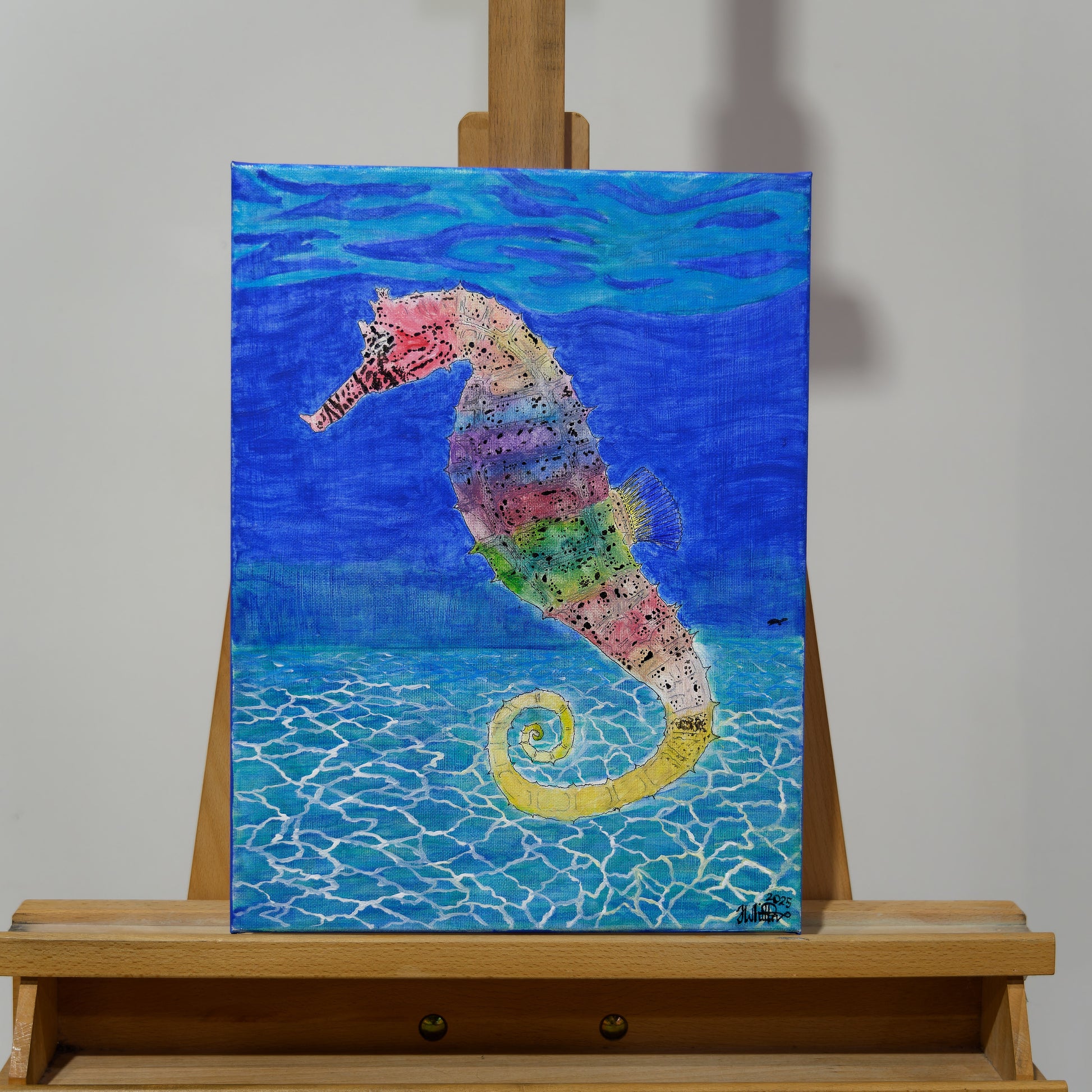 This artwork features a graceful seahorse as it frolics through the ocean, it showcases it vibrancy, majesty and the beauty of marine life.